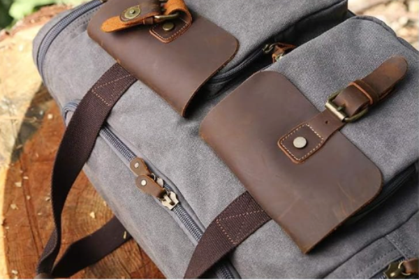 Pour le style et la durabilité, on ajoute du cuir pleine fleur sur les anses, rabats et boucles : robuste, authentique et parfaitement assorti à la toile canevas.